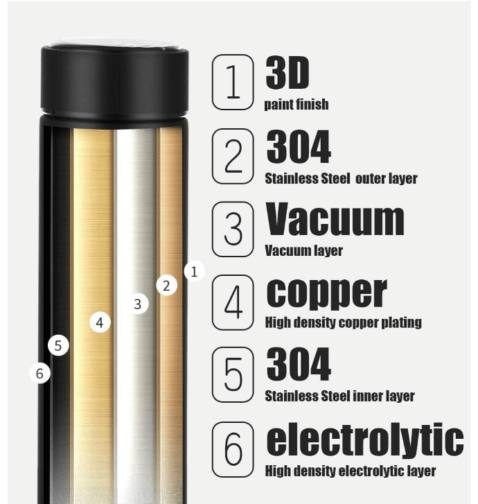 زجاجة المياه الذكية مصنوعة من الستانلس ستيل عالي الجودة الآمن غذائياً، مقاومة للأتربة والماء والصدأ بإغلاق جيد.