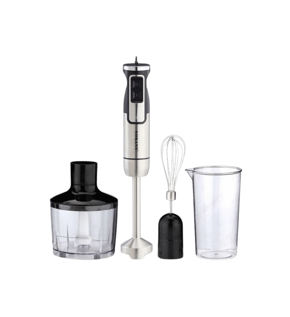 Sokany SK-1725-4 هو خلاط يدوي بمحرك قوي بقوة 800 واط. تحتوي على إعدادين للسرعة وتأتي مع شفرتين من الفولاذ المقاوم للصدأ: شفرة مزج وشفرة تقطيع. تعتبر شفرة الخلط مثالية للعصائر والحساء والصلصات.