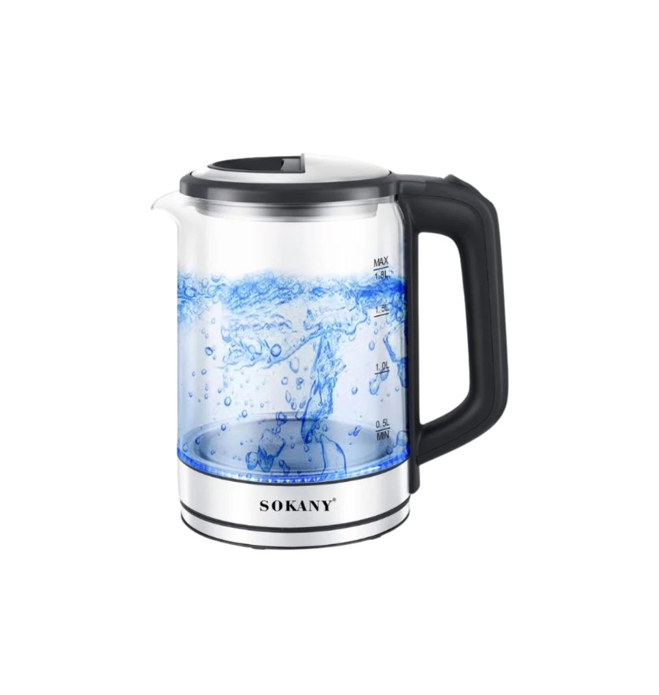 غلاية سوكاني SK-09012 زجاج 1.8 لتر 1500 وات تعتبر إضافة عملية وأنيقة لأي مطبخ عصري. الغلاية مصنوعة من زجاج شفاف مقاوم للحرارة، واللي بيسمحلك تتابعي عملية الغلي بوضوح لحظة بلحظة، وكمان يضيف لمسة جمالية مميزة لمطبخك.