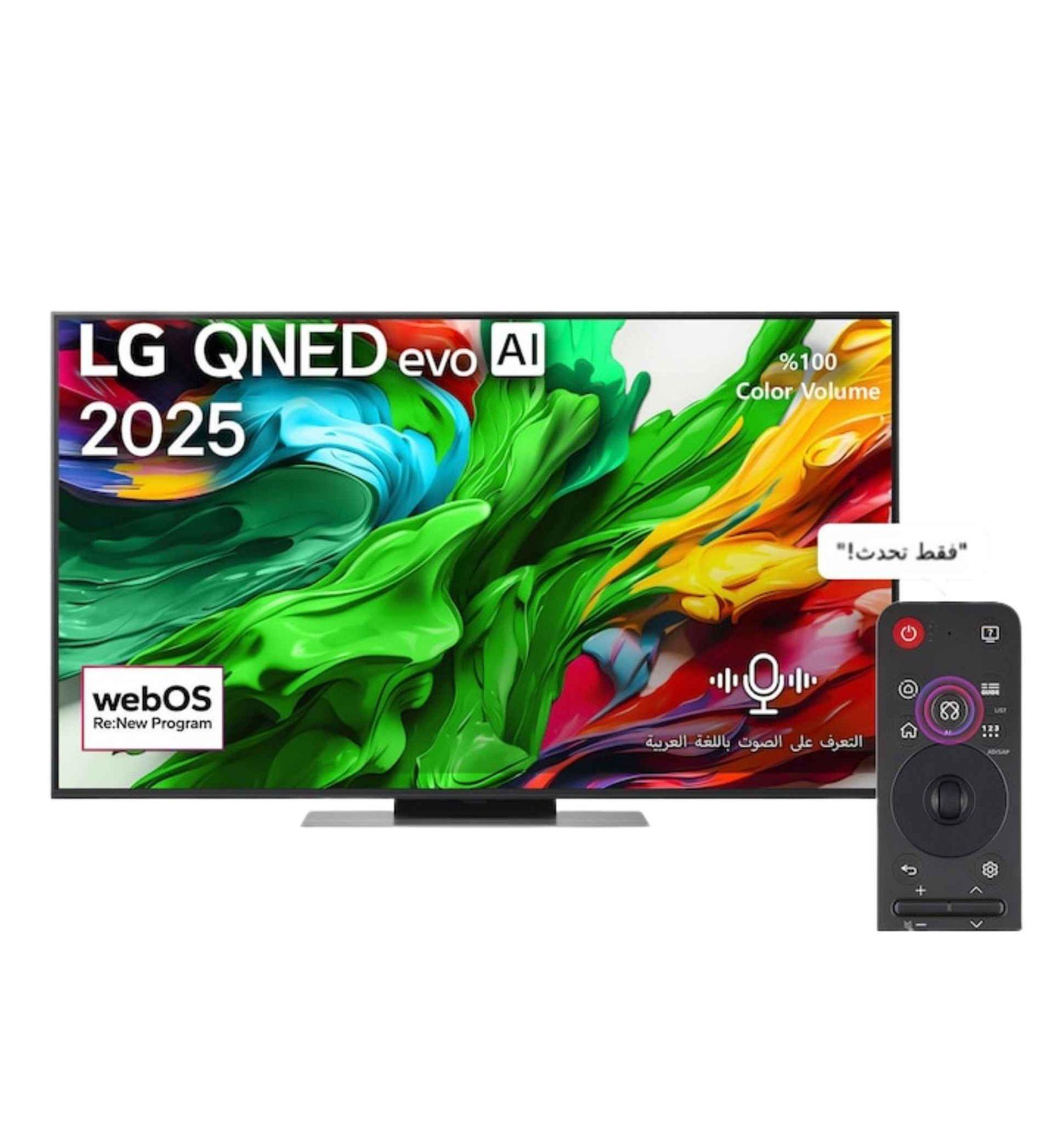 نظام webOS مع AI Magic Remote يتيح لك البحث الذكي AI Search، والروبوت الذكي AI Chatbot، والمساعد الذكي AI Concierge، بينما يقوم برنامج webOS Re:New بتحديث الجهاز سنويًا لمدة 5 سنوات.